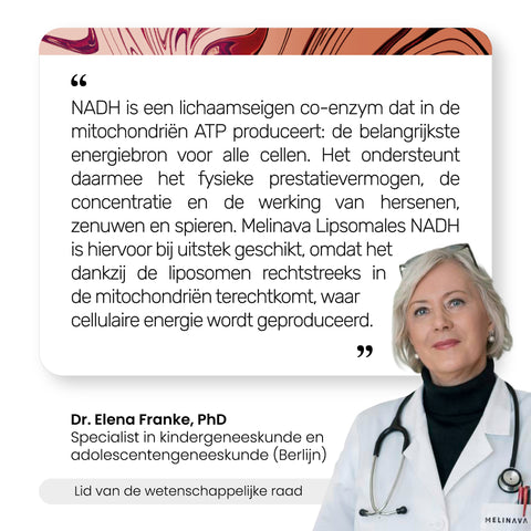 Hier komt Melinava liposomaal NADH in beeld. Dankzij de moderne, goed opneembare formule ondersteunt het de energievoorziening in de cellen en geeft het nieuwe energie tot in de cellen – voor meer focus, vitaliteit en mentale helderheid in het dagelijks leven.