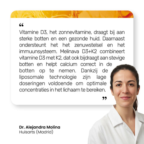 Daarom is er Melinava Vitamin D3+K2 : vitamine D helpt calcium op te nemen, terwijl K2 ervoor zorgt dat het calcium in de botten terechtkomt en niet in de bloedvaten. Zo bent u optimaal ondersteund – voor meer energie en een zonnige dag!